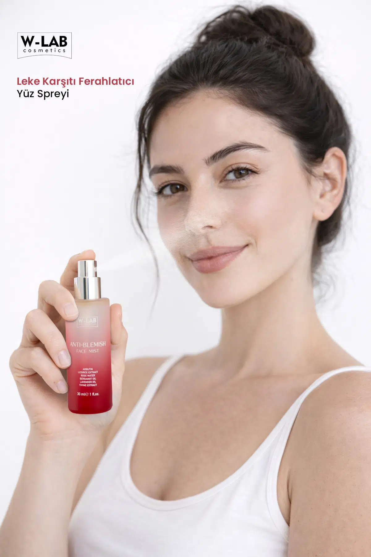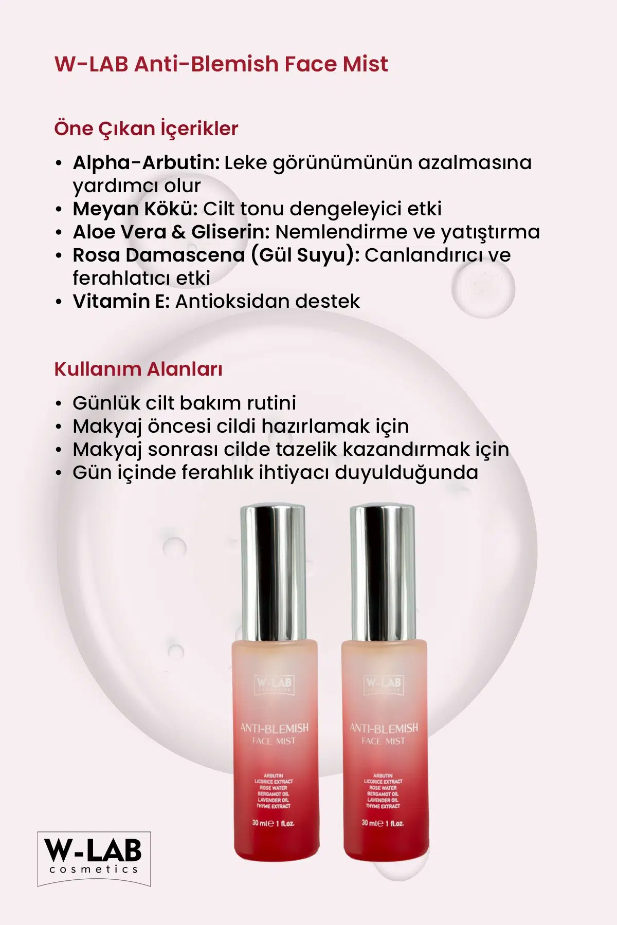 W-LAB Anti-Blemish Face Mist, ciltte oluşan leke görünümünü azaltmaya ve cilt tonunu dengelemeye yardımcı olmak üzere geliştirilmiş ferahlatıcı bir yüz spreyidir.