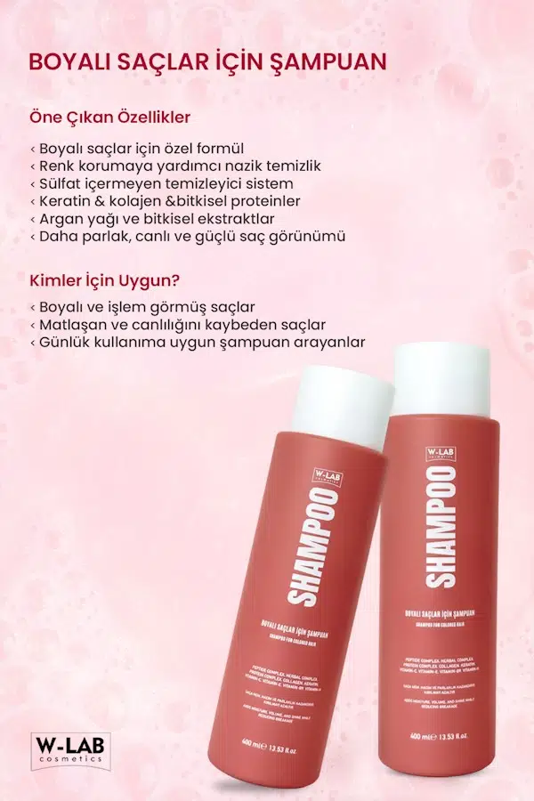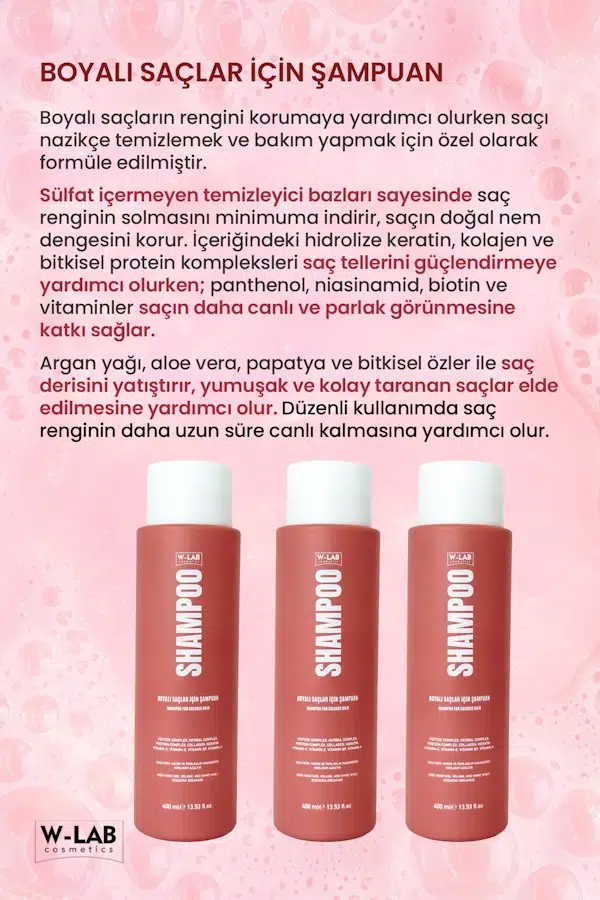 W-LAB BOYALI SAÇLAR İÇİN ŞAMPUAN 400ML,boyalı saçların rengini korumaya yardımcı olurken saçı nazikçe temizlemek ve bakım yapmak için özel olarak formüle edilmiştir. Sülfat içermeyen temizleyici bazları sayesinde saç renginin solmasını minimuma indirir, saçın doğal nem dengesini korur.