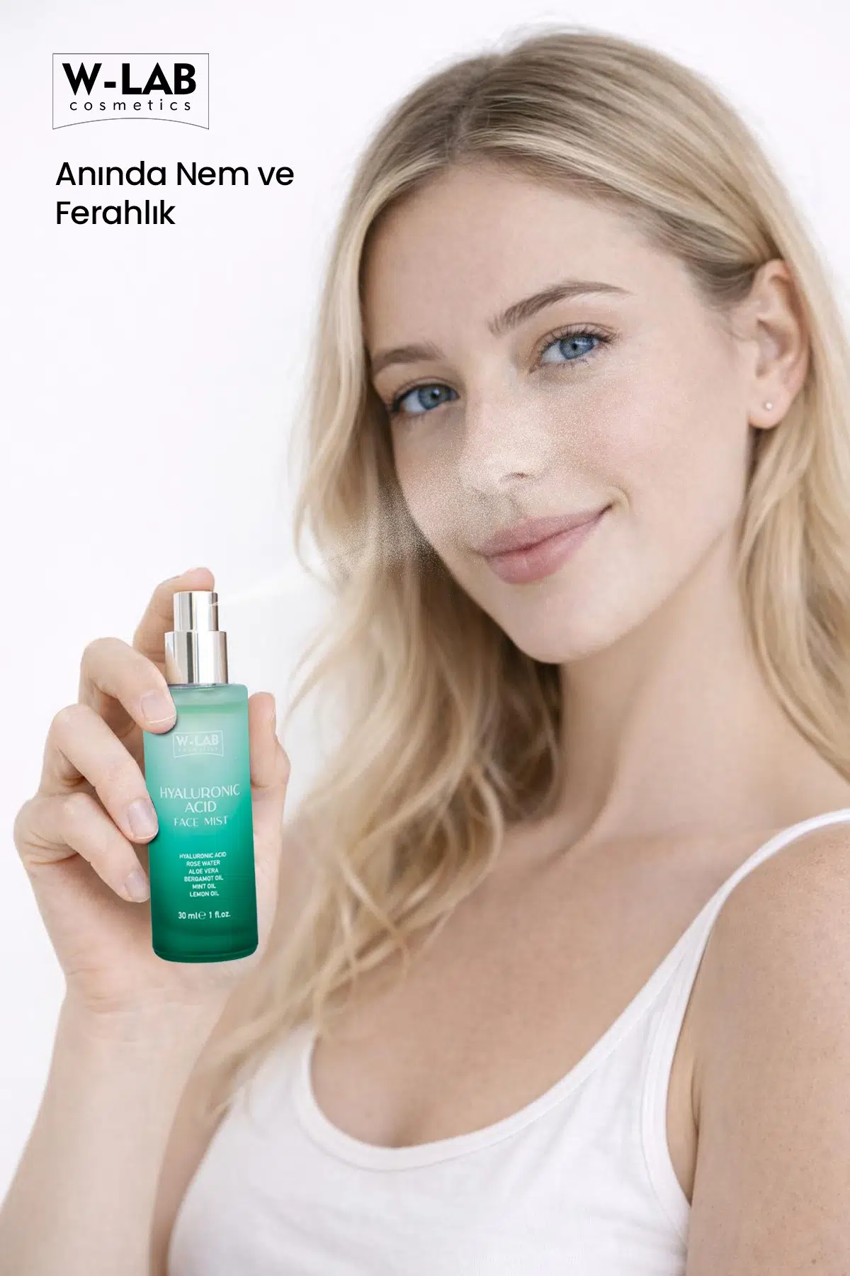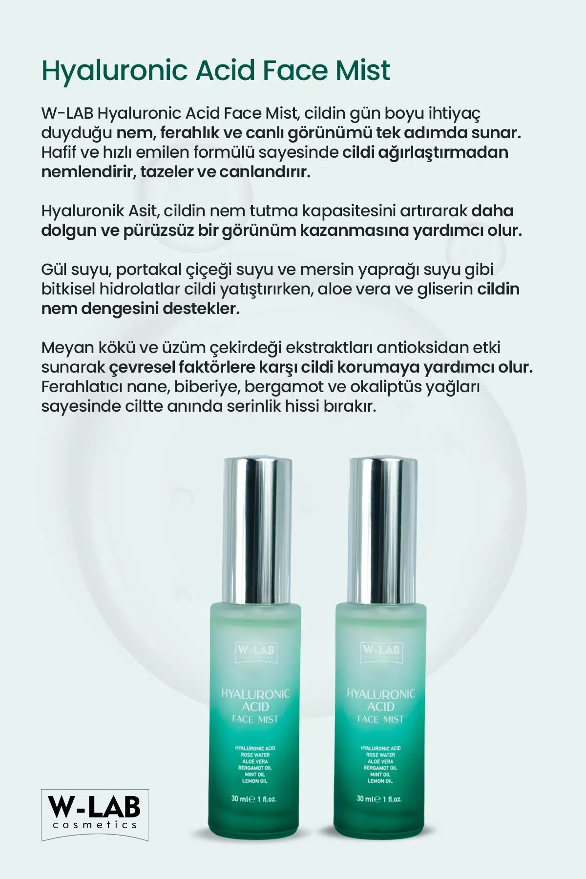 W-LAB Hyaluronic Acid Face Mist, cildin gün boyu ihtiyaç duyduğu nem, ferahlık ve canlı görünümü tek adımda sunar. Hafif ve hızlı emilen formülü sayesinde cildi ağırlaştırmadan nemlendirir, tazeler ve canlandırır.Doğal yağlar içerir. İçeriğinde yer alan Sodium Hyaluronate (Hyaluronik Asit), cildin nem tutma kapasitesini artırarak daha dolgun ve pürüzsüz bir görünüm kazanmasına yardımcı olur. Gül suyu, portakal çiçeği suyu ve mersin yaprağı suyu gibi bitkisel hidrolatlar cildi yatıştırırken, aloe vera ve gliserin cildin nem dengesini destekler.Meyan kökü ve üzüm çekirdeği ekstraktları antioksidan etki sunarak çevresel faktörlere karşı cildi korumaya yardımcı olur. E vitamini (Tocopheryl Acetate) ile cildin canlı ve sağlıklı görünümü desteklenir.Ferahlatıcı nane, biberiye, bergamot ve okaliptüs yağları sayesinde ciltte anında serinlik hissi bırakır. Makyaj öncesi, makyaj sonrası veya gün içinde ihtiyaç duydukça rahatlıkla kullanılabilir.