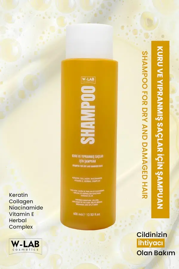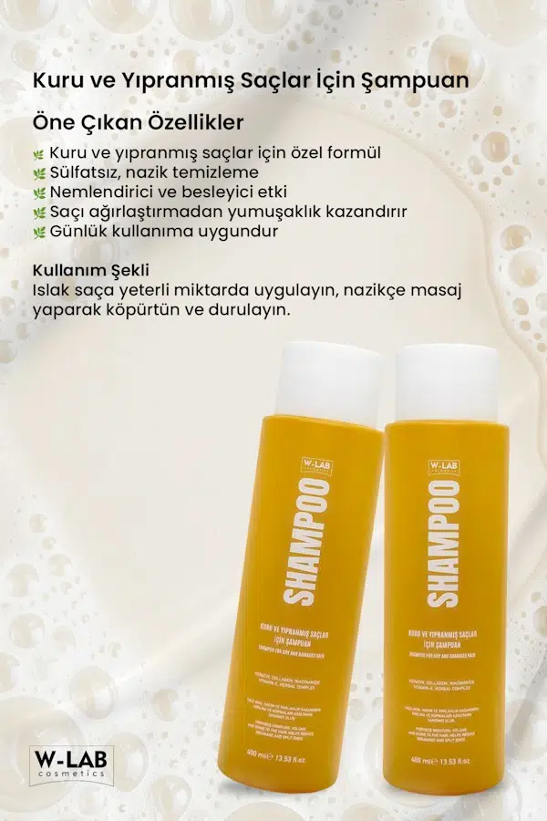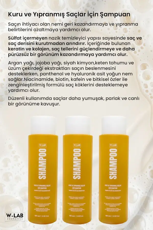 W-LAB Kuru ve Yıpranmış Saçlar İçin Şampuan 400 ml, saçın ihtiyacı olan nemi geri kazandırmaya ve yıpranma belirtilerini azaltmaya yardımcı olur. Sülfat içermeyen nazik temizleyici yapısı sayesinde saç ve saç derisini kurutmadan arındırır.