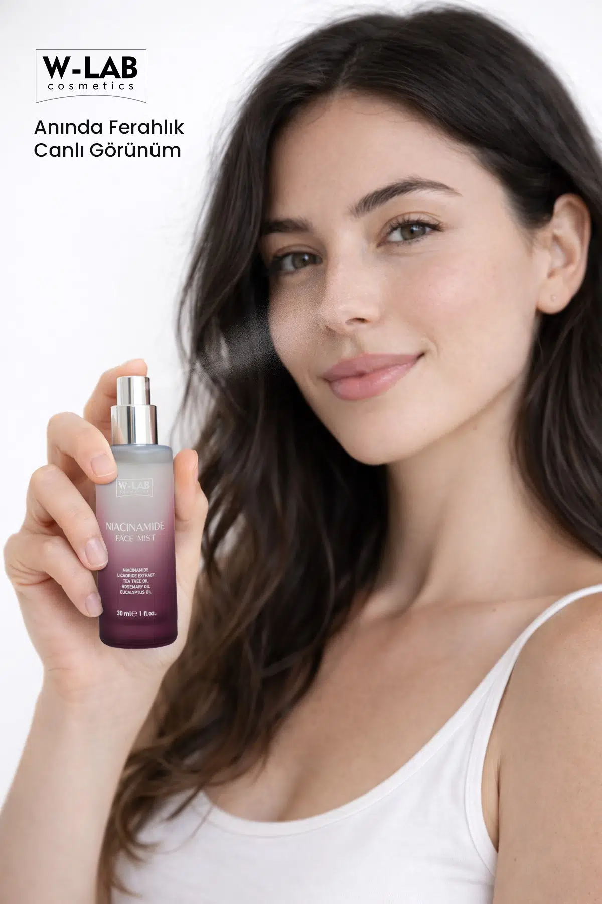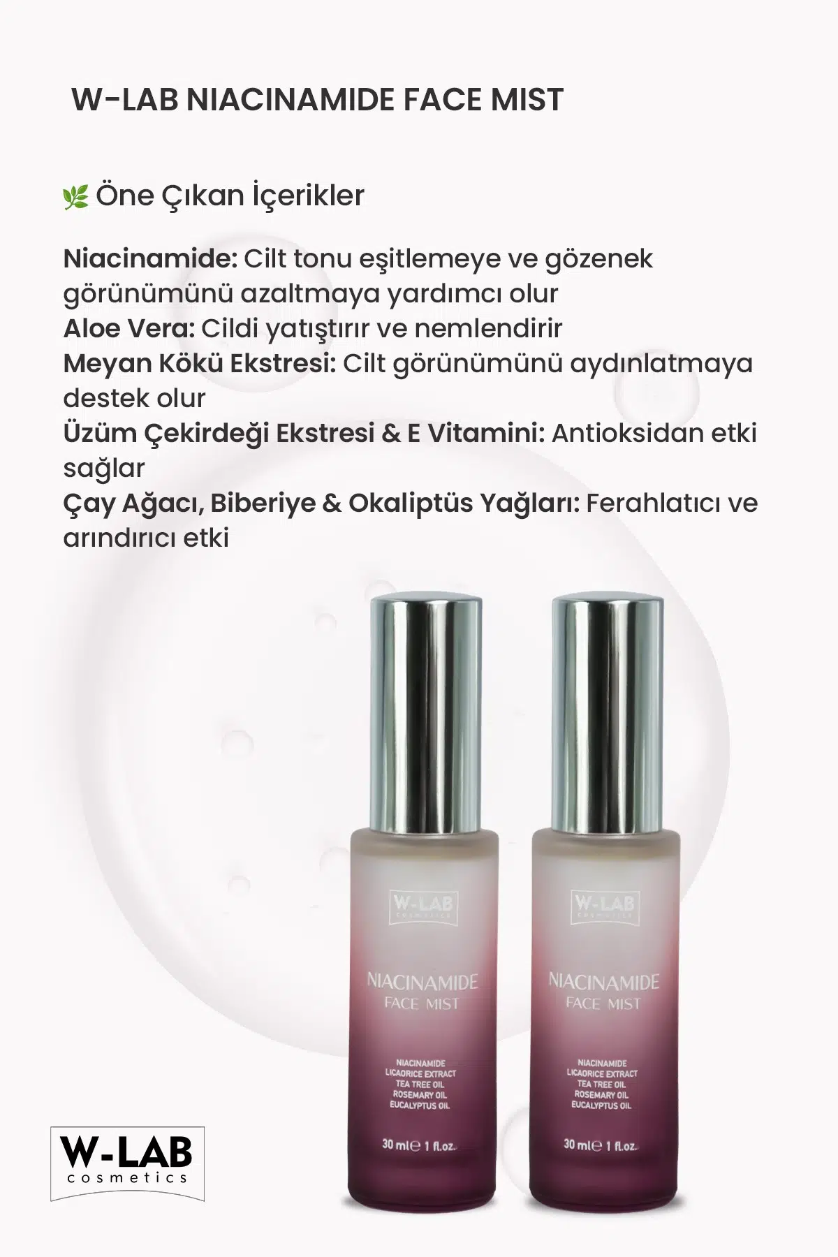 W-LAB Niacinamide Face Mist; niacinamide, aloe vera ve bitkisel özlerle zenginleştirilmiş formülü sayesinde cildi nemlendirir, canlandırır ve cilt tonunun daha dengeli görünmesine yardımcı olur.Cildine anında ferahlık, dengeli bakım ve ışıltı sağlar. Hafif ve ferahlatıcı yapısıyla gün içinde makyaj öncesi, sonrası ya da tazelenmek için idealdir. Doğal yağlar içerir.Hızlı emilen yapısı sayesinde ciltte ağırlık hissi bırakmadan ferahlık sağlar. Düzenli kullanımda cildin daha canlı, pürüzsüz ve bakımlı görünmesine destek olur.