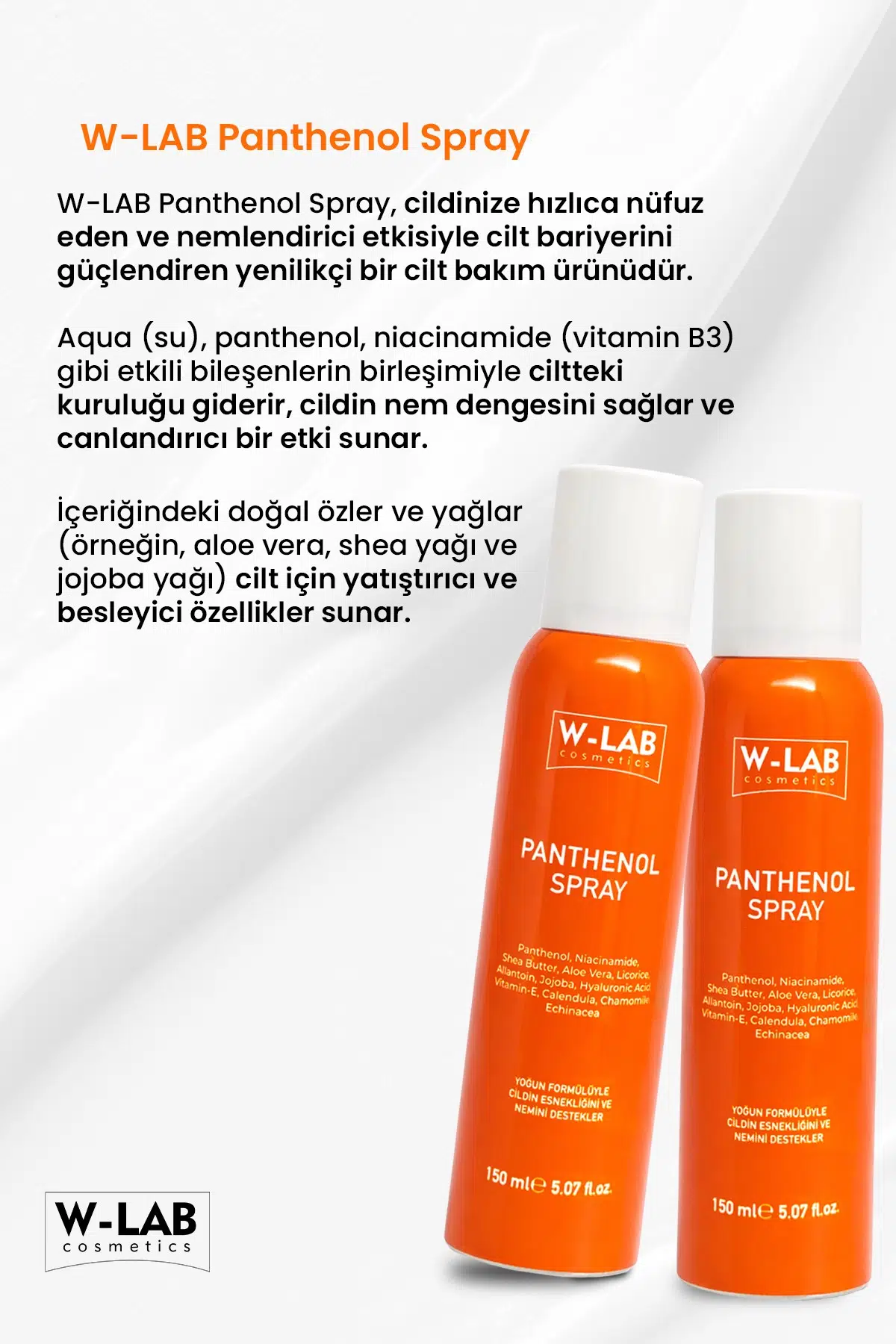 W-LAB Panthenol Spray, cildinize hızlıca nüfuz eden ve nemlendirici etkisiyle cilt bariyerini güçlendiren yenilikçi bir cilt bakım ürünüdür. Aqua (su), panthenol, niacinamide (vitamin B3) gibi etkili bileşenlerin birleşimiyle ciltteki kuruluğu giderir, cildin nem dengesini sağlar ve canlandırıcı bir etki sunar. İçeriğindeki doğal özler ve yağlar (örneğin, aloe vera, shea yağı ve jojoba yağı) cilt için yatıştırıcı ve besleyici özellikler sunar.